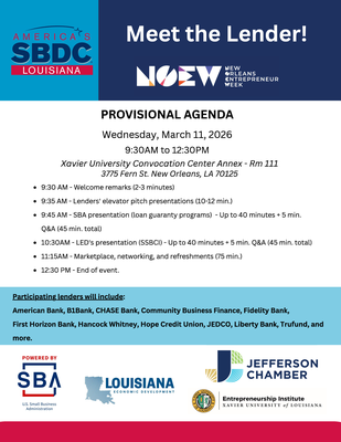 This event is powered by the U.S. Small Business Administration and hosted in partnership with Louisiana SBDC, Louisiana Economic Development, Xavier University’s Entrepreneurship Institute, and Jefferson Chamber.