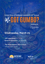 United Way of Southeast Louisiana, in partnership with the Royal Sonesta New Orleans, is proud to present the 24th Annual “GOT GUMBO?” Cook-Off, presented by Chalmette Refining, on Wednesday, March 25, 2026, from 6:00 p.m. to 8:30 p.m.